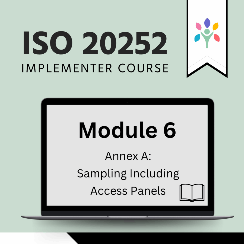 This optional module focuses on Annex A of ISO 20252, covering sampling methods and the management of access panels. Ideal for organisations conducting quantitative research, panel management, or sampling operations.